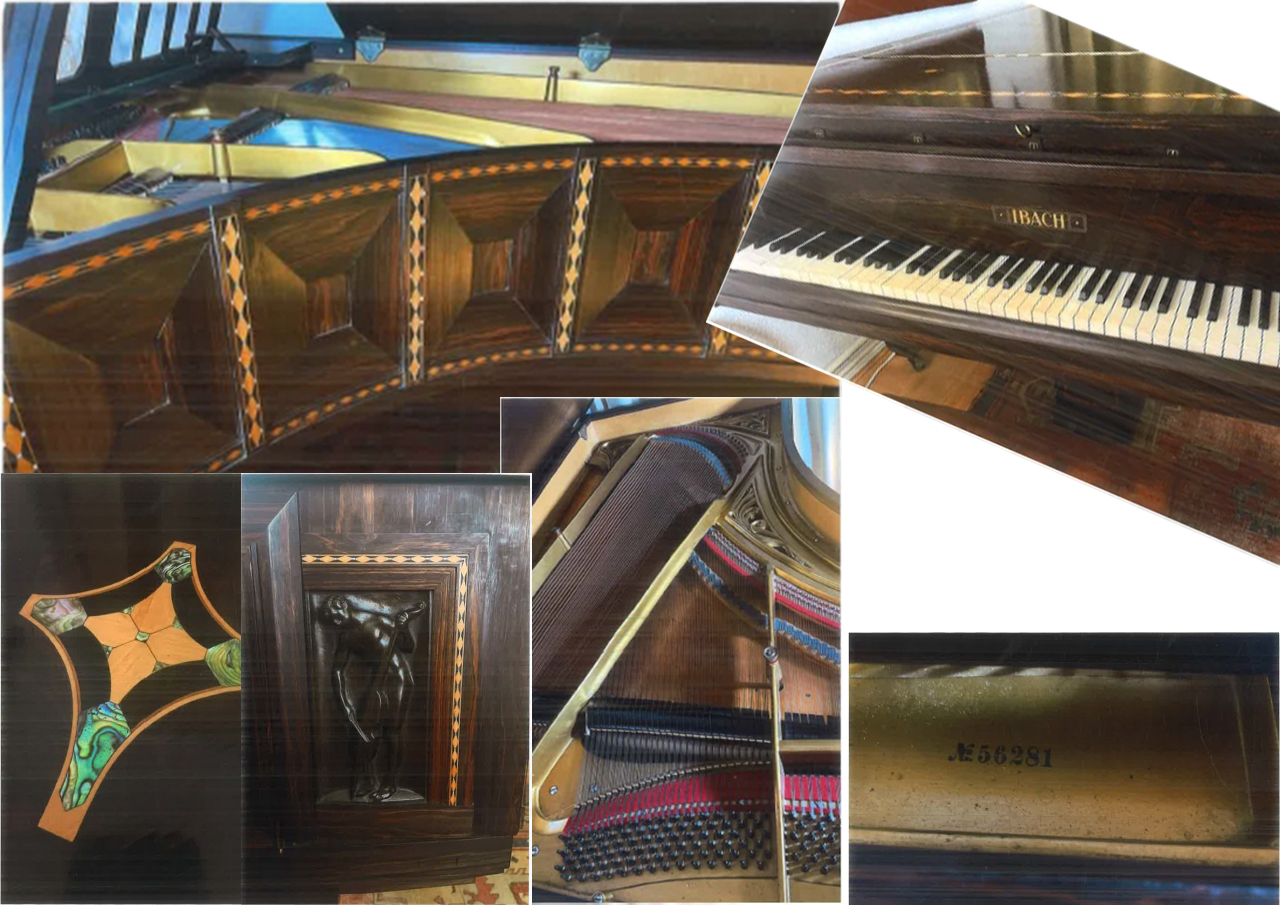 The instrument has the typical design of a grand piano, but instead of black shellac or polyester lacquer, the case is crafted entirely from Makassar and ebony with inlays. The sides are decorated with a total of 17 tall, rectangular panels, four of which are adorned with bronze sculptures. Above the keyboard are six further rectangular panels, each framed with fillets of diamond-patterned parquet.
